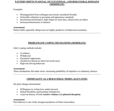A Pre Incident Indicator Assessment provides a detailed examination of early warning signs that historically correlate with violent, criminal, disruptive, or malicious behavior. PMI analysts identify indicators such as casing behavior, pattern shifts, surveillance triggers, stressor escalation, anomalous digital activity, and signs of grievance development. The assessment evaluates the subject’s emotional, environmental, and situational trajectory to determine the probability of behavioral escalation. This product is highly valuable for corporate environments, schools, religious institutions, residential communities, event security teams, and private clients concerned about emerging behavioral threats. By identifying markers at the earliest stage, PMI enables clients to intervene, reinforce protective measures, and prevent incidents before they occur.